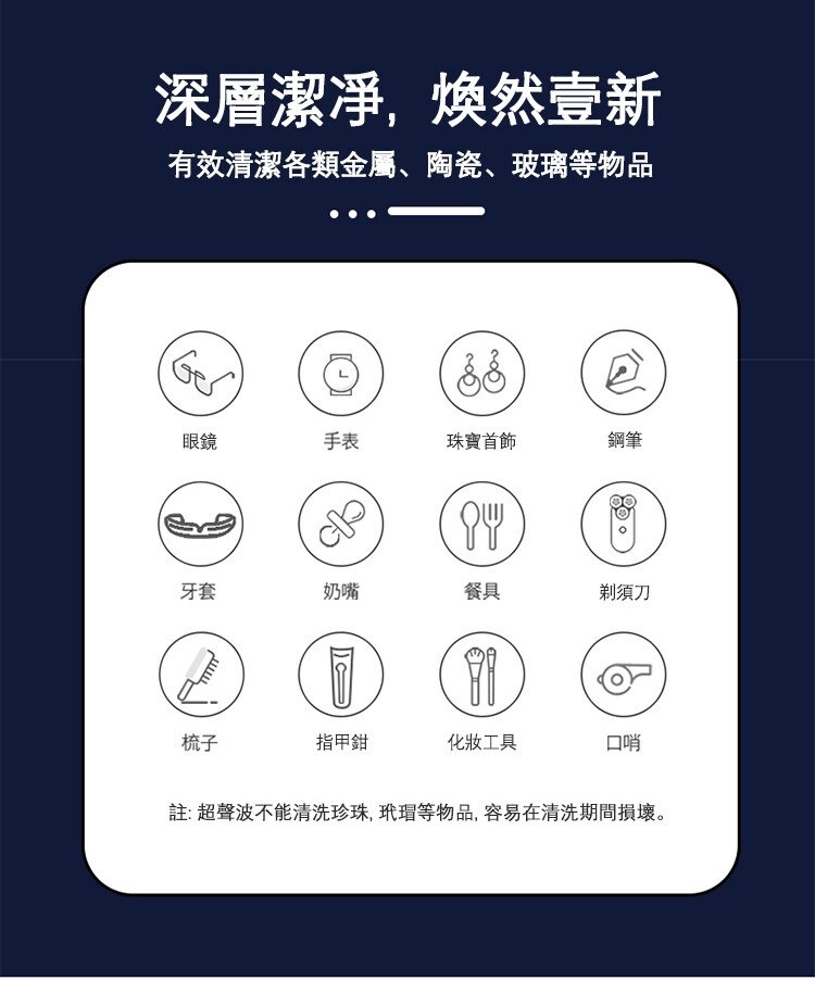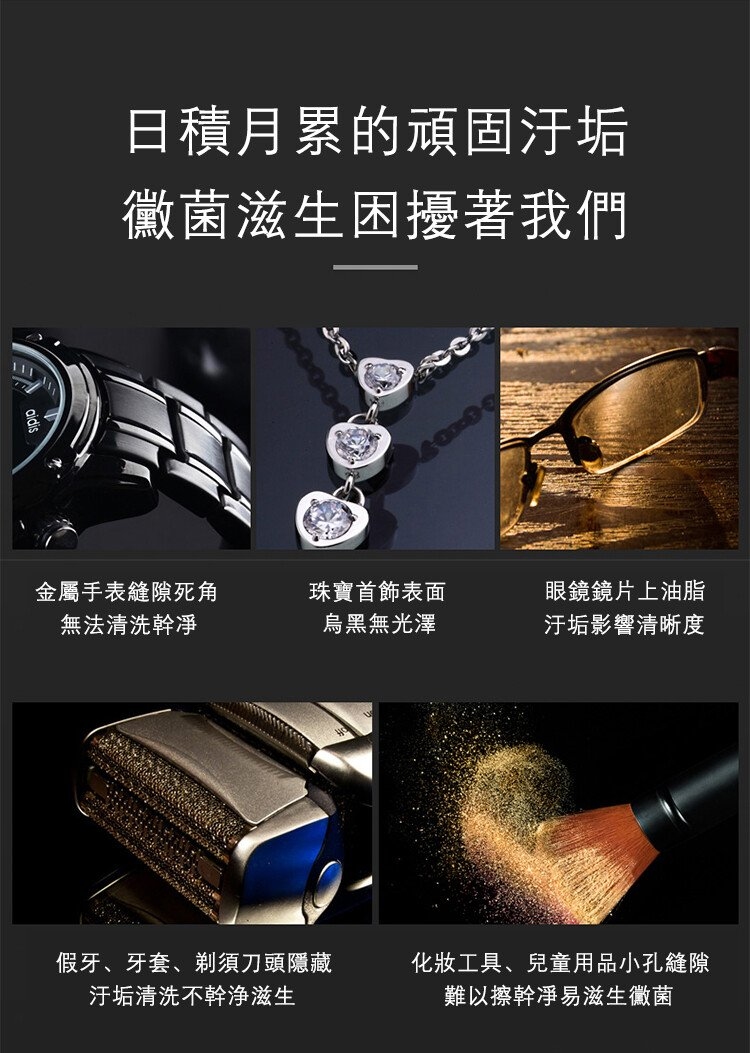 • 多用途清潔,適用於眼鏡、金屬錶帶、首飾、牙套等各類貼身物品