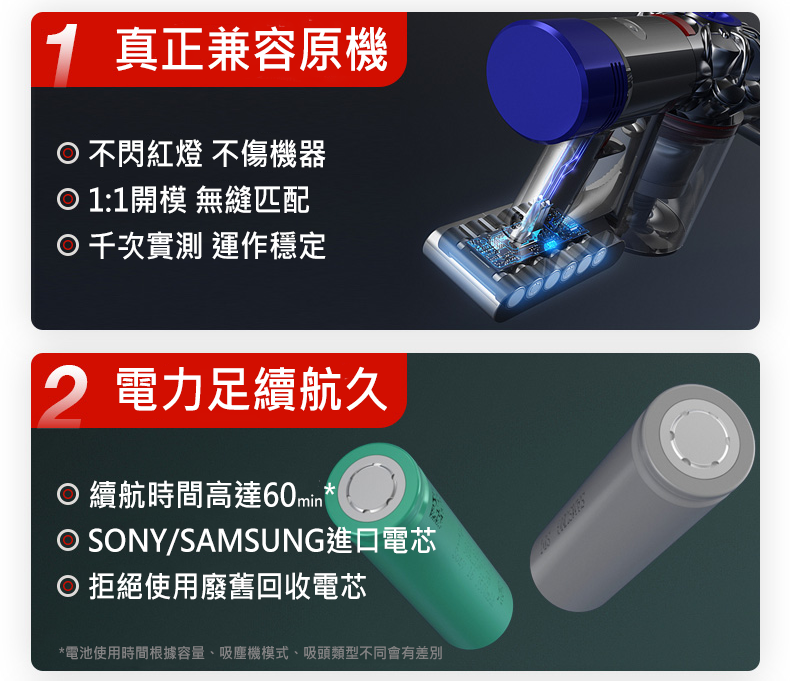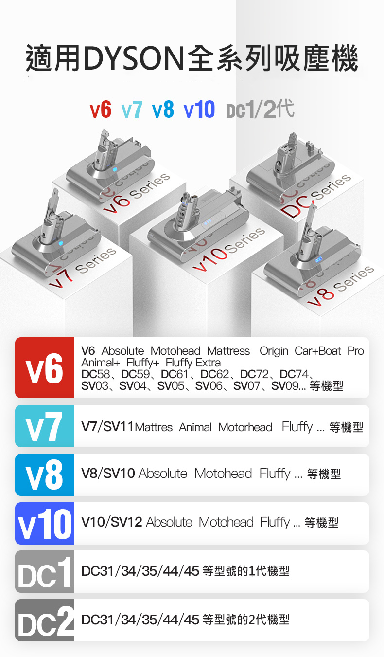 本店所售的鋰電池不是DYSON原裝電池,而是兼容DYSON系列產品的替代備用電池。